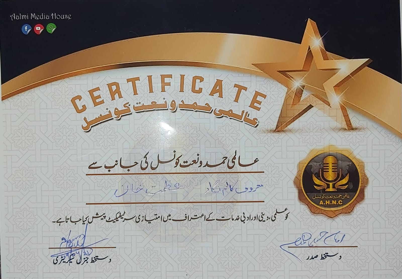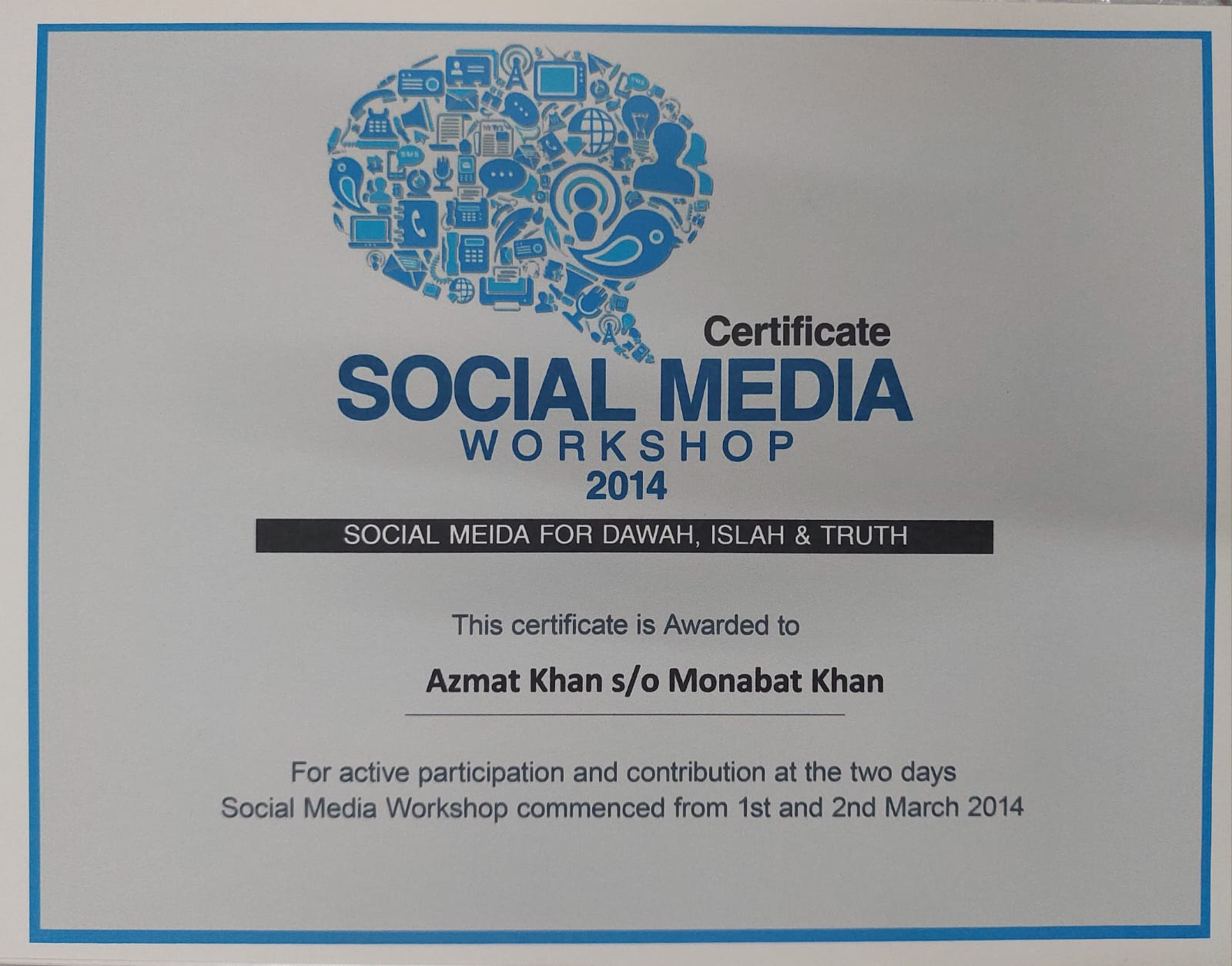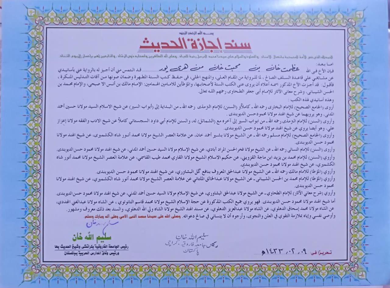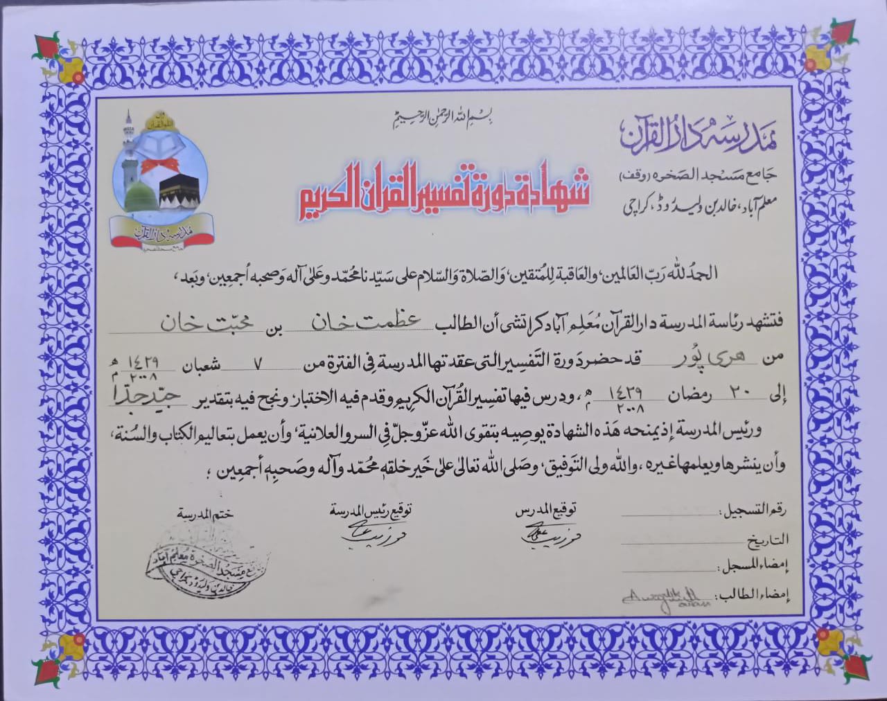 Later, he obtained the Shahadat-ul-Alamiyah degree in 2011 from Madrasah Imam-e-Azam Abu Hanifa (RA) located at Makkah Masjid, Muhammad Ali Society, Karachi.