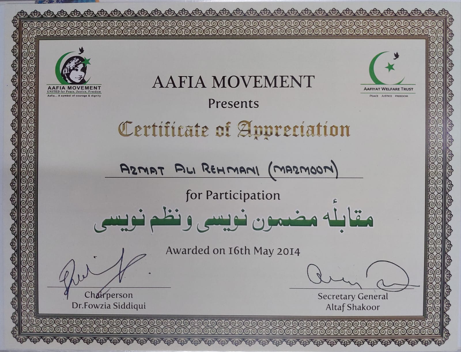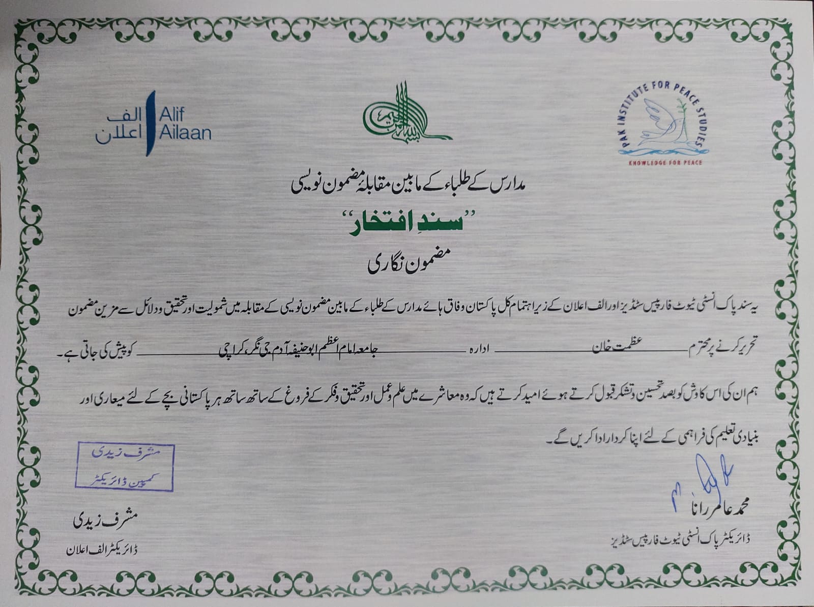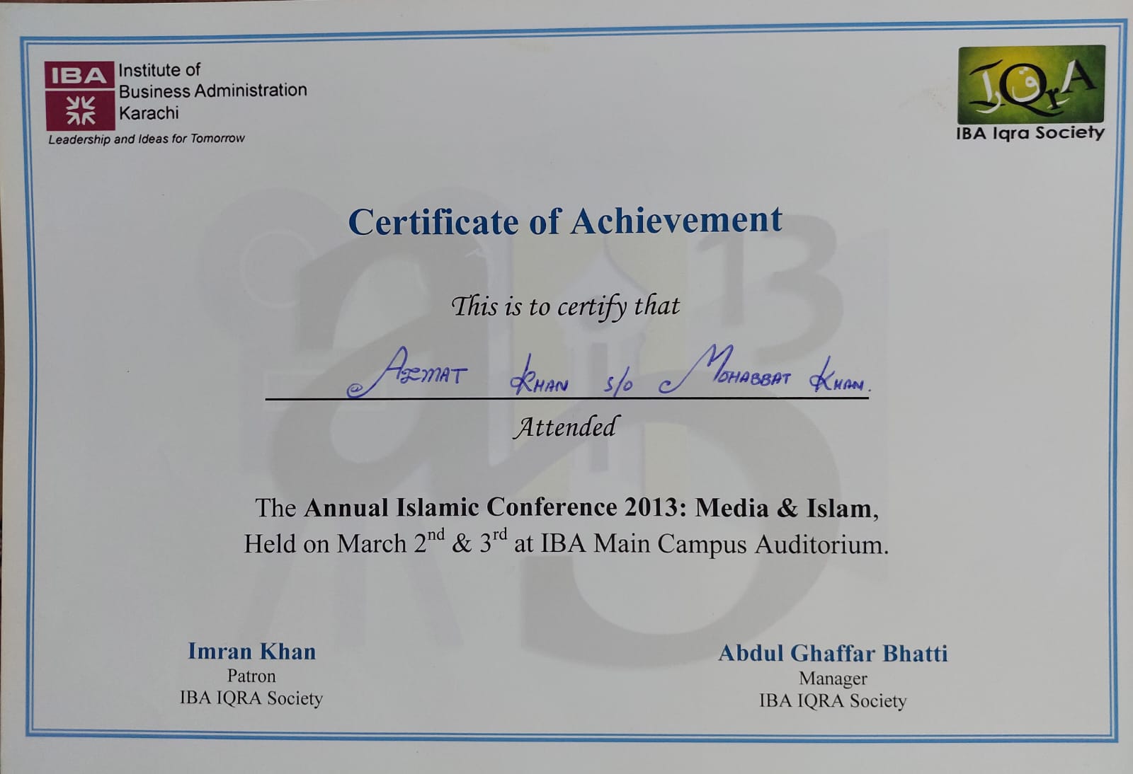 Later, he obtained the Shahadat-ul-Alamiyah degree in 2011 from Madrasah Imam-e-Azam Abu Hanifa (RA) located at Makkah Masjid, Muhammad Ali Society, Karachi.