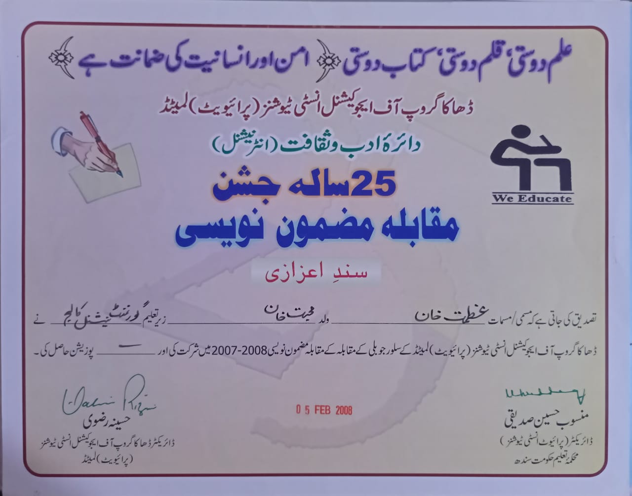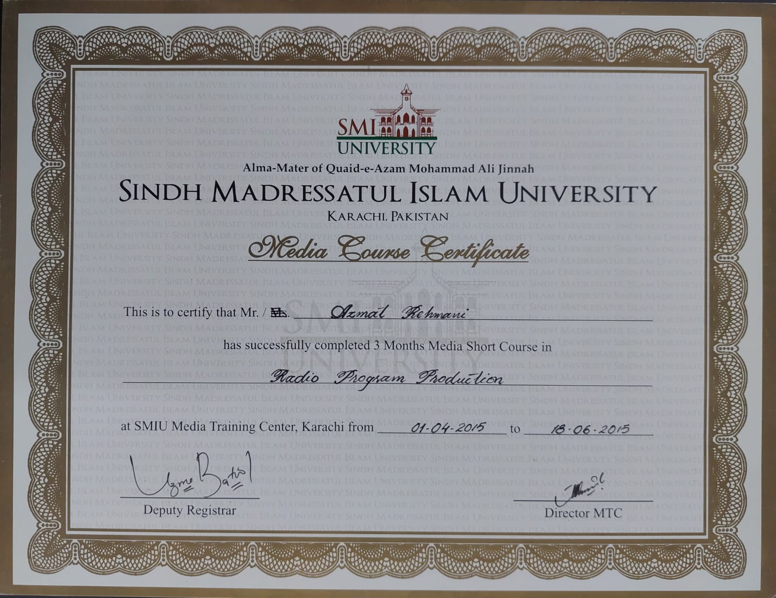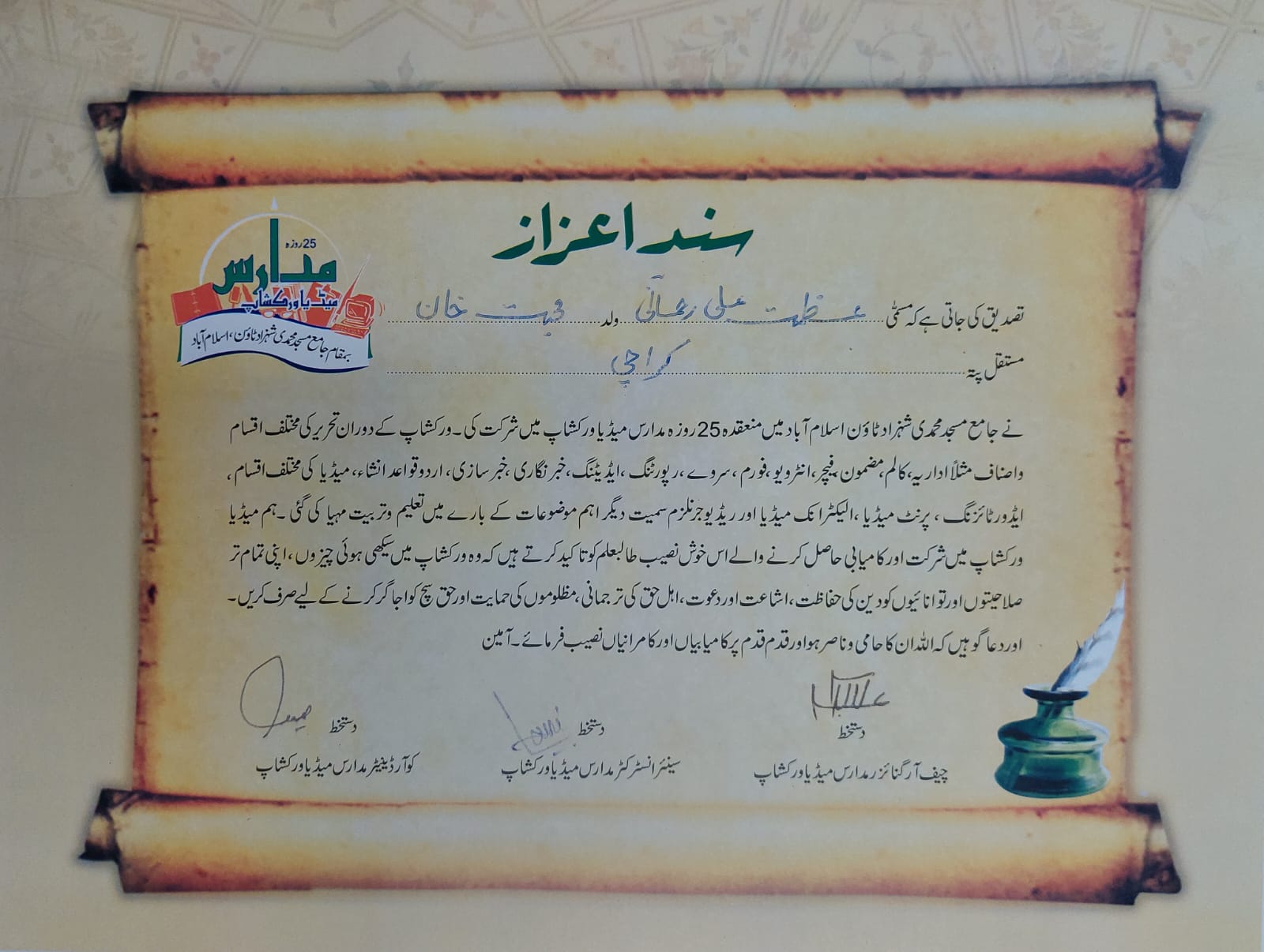 Afterward, based on Darjah Sadsah, he passed four compulsory papers and obtained an equivalent BA degree from the Federal Urdu University. He then completed MA in Arabic in 2011 from the Federal Urdu University. In 2016, he secured first position in MA Mass Communication from the Federal Urdu University and was awarded a Gold Medal for his outstanding academic performance.