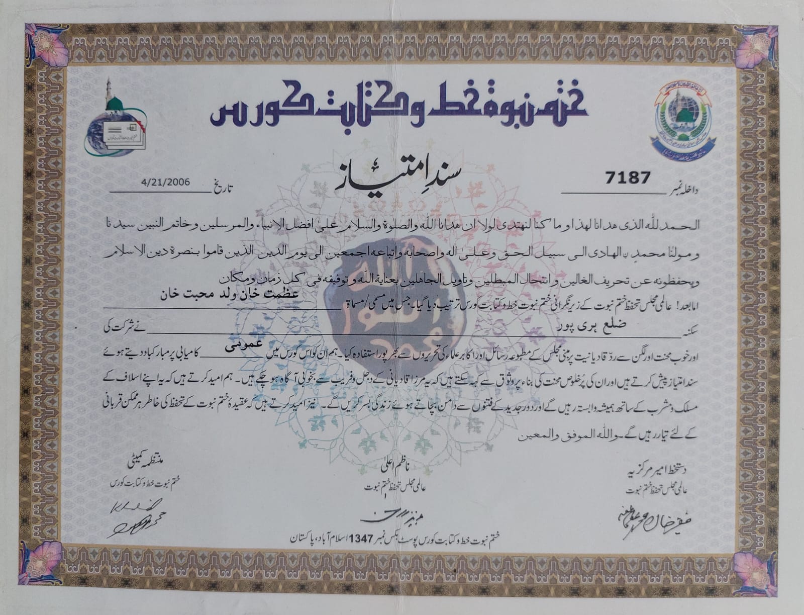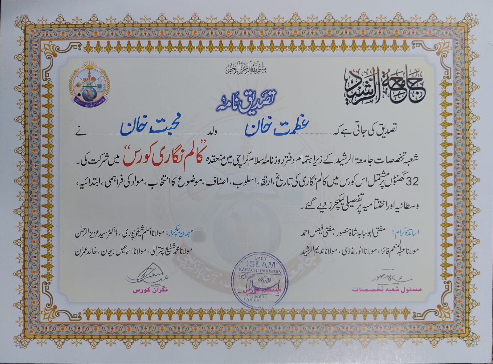 Afterward, following the wishes of his parents, he pursued Islamic religious education and joined the well-known religious institution Jamia Abdullah Ibn Masood in Haripur, where he studied the Holy Quran and the first level of Dars-e-Nizami (Darjah Ula).