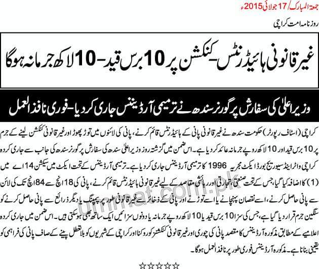 غیر قانونی ہائیڈرنٹس اور کنکشن پر 10 برس قید اور10 لاکھ روپے جرمانہ