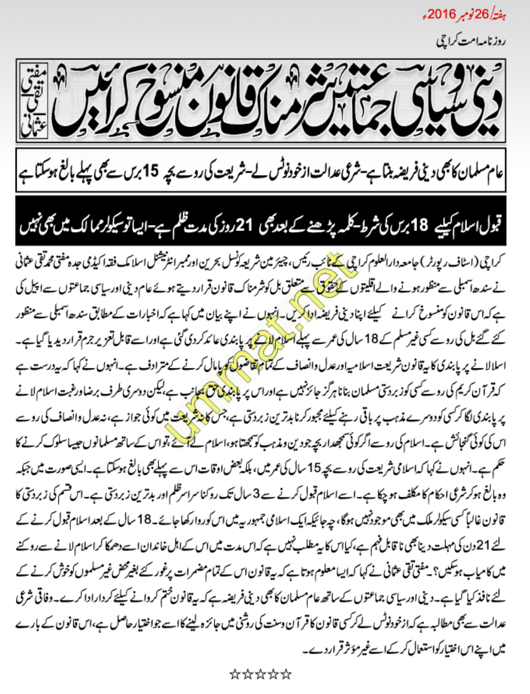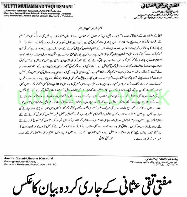 دینی و سیاسی جماعتیں شرمناک قانون منسوخ کرائیں: مفتی تقی عثمانی