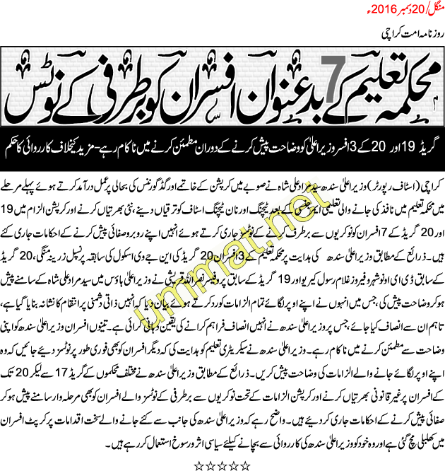 محکمہ تعلیم کے 7 بدعنوان افسران کو بر طرفی کے نوٹس
