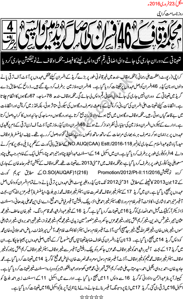 محکمہ اوقاف کے 46 افسران کی اصل گریڈ میں واپسی، 4 برطرف