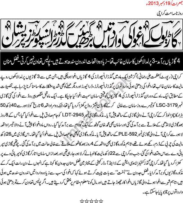گاڑیوں کے اغوا کی وارداتیں بڑھ گئیں، گڈز ٹرانسپوٹرز پریشان