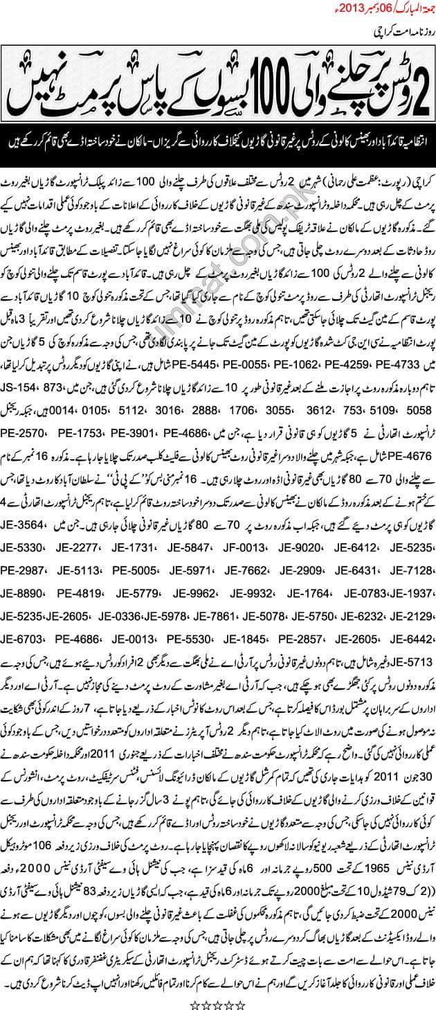 2 روٹس پر چلنے والی 100 بسوں کے پاس پرمٹ نہیں